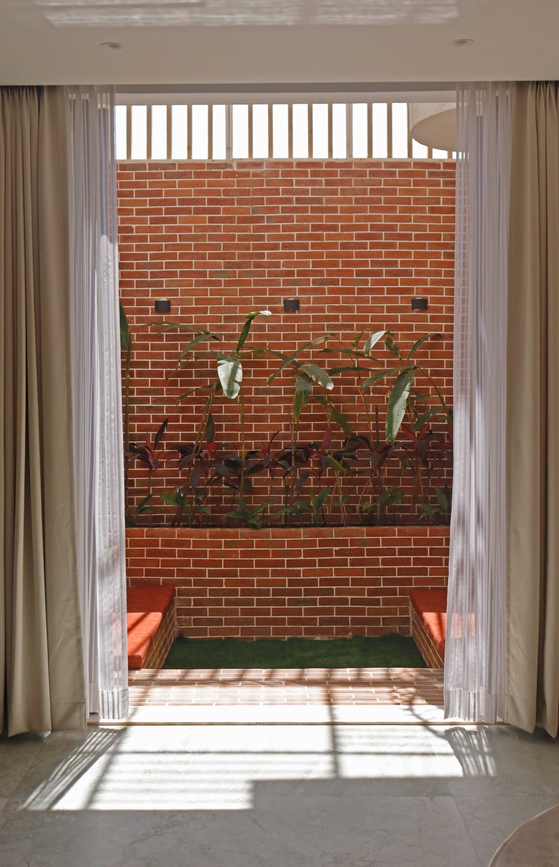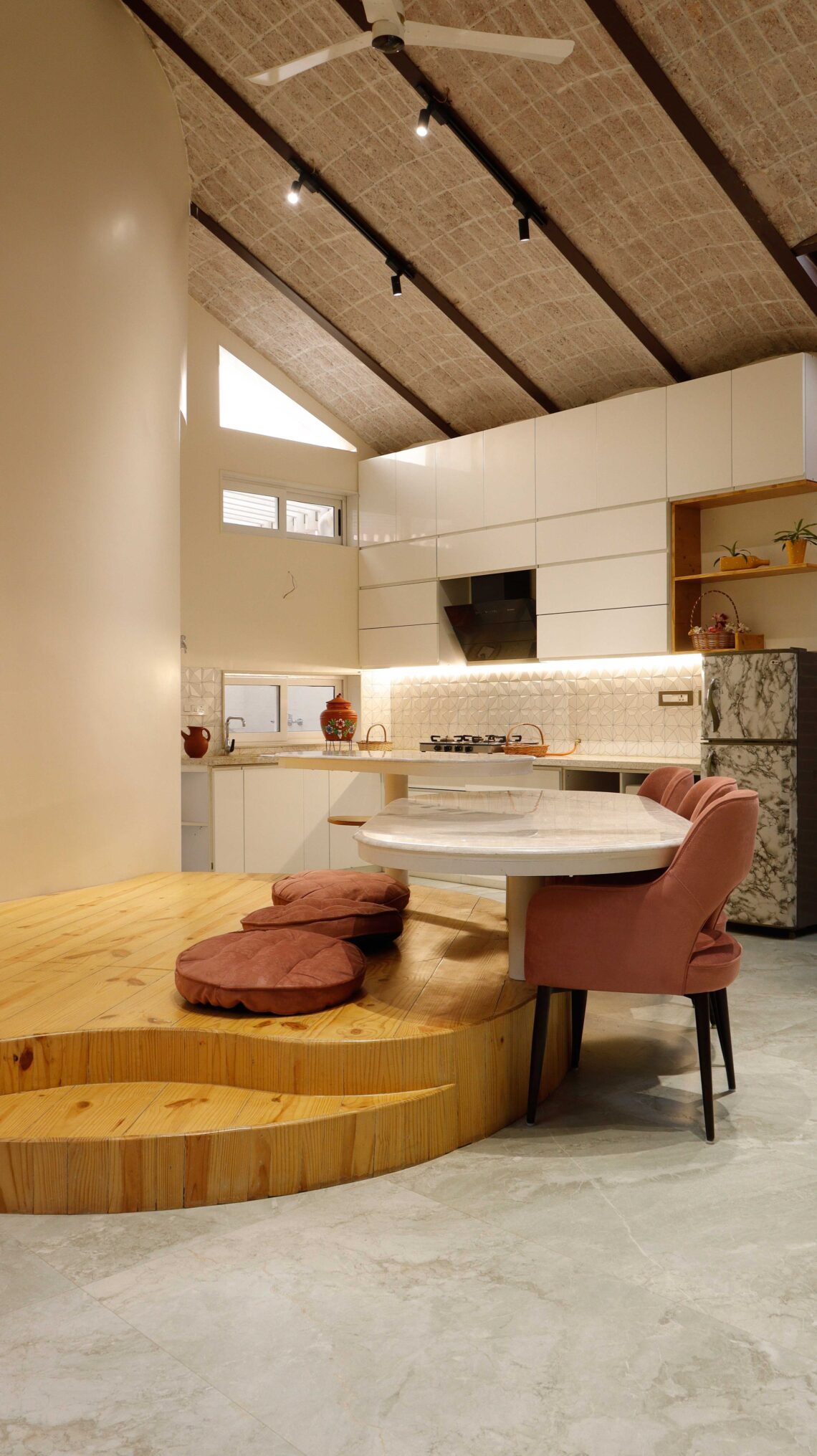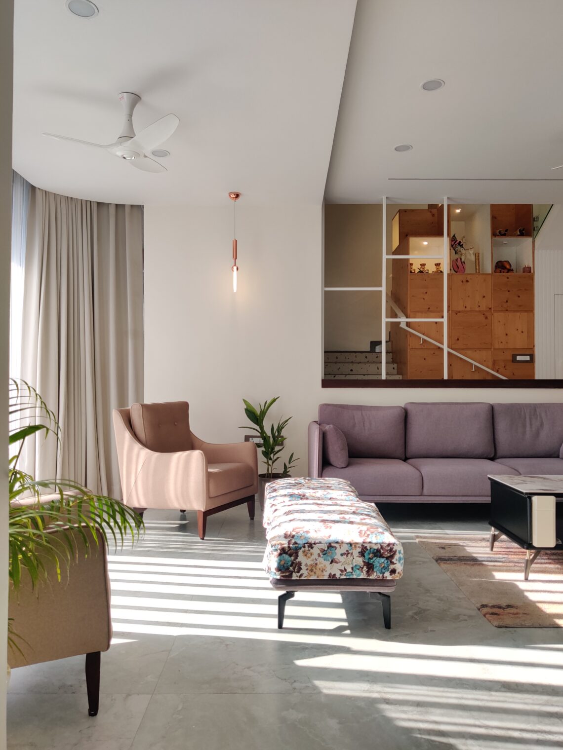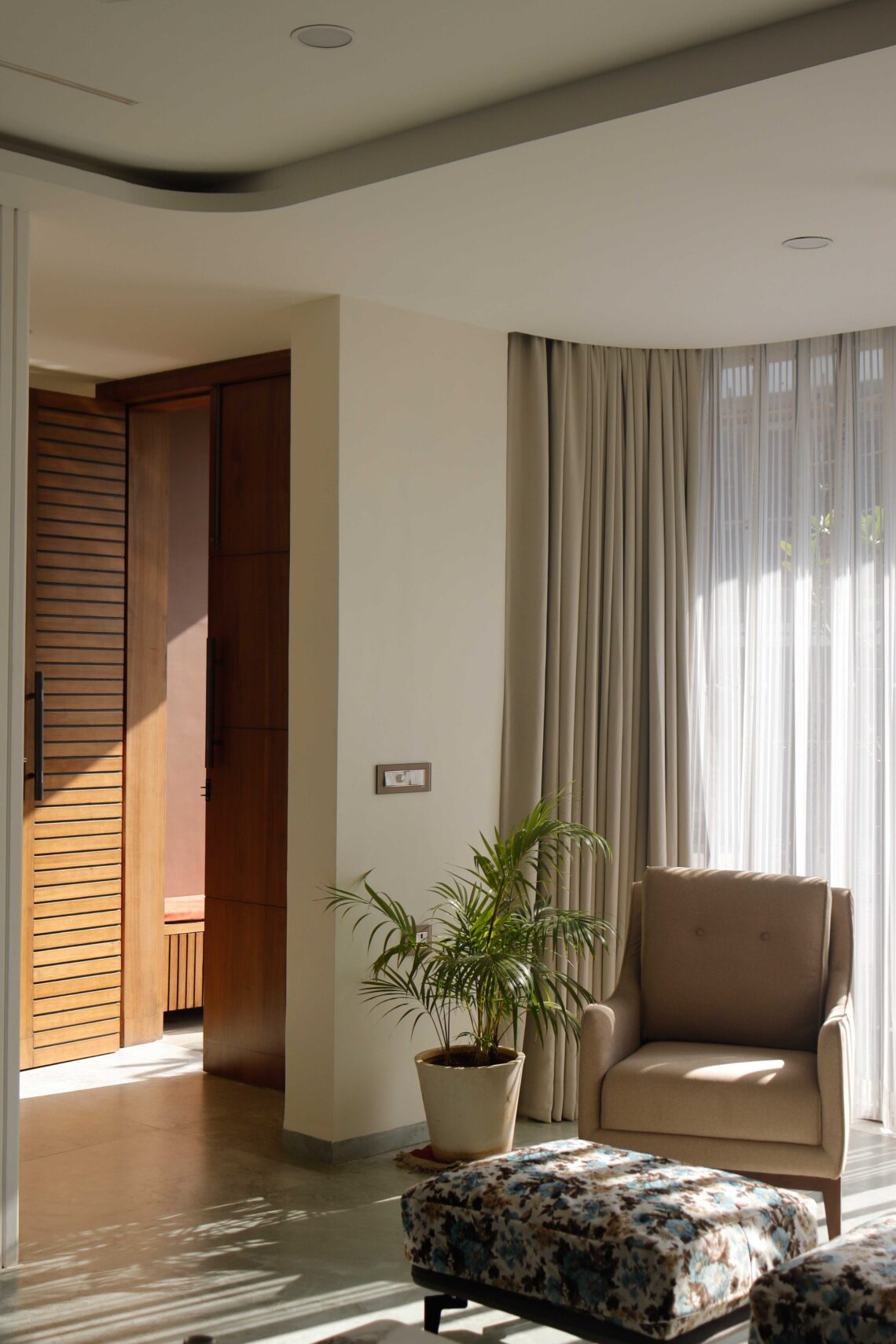 Residence situated in a gated community in vicinity of the reserved forest area of Ralamandal , the concept was to maximize on the east facing plot offering views of the hills from living spaces. A sloping double height jack vault roof adds character to the dining kitchen area and an open breezy plan with sunlight piercing through courtyards and skylights at all times enables a lifestyle among the natural elements.