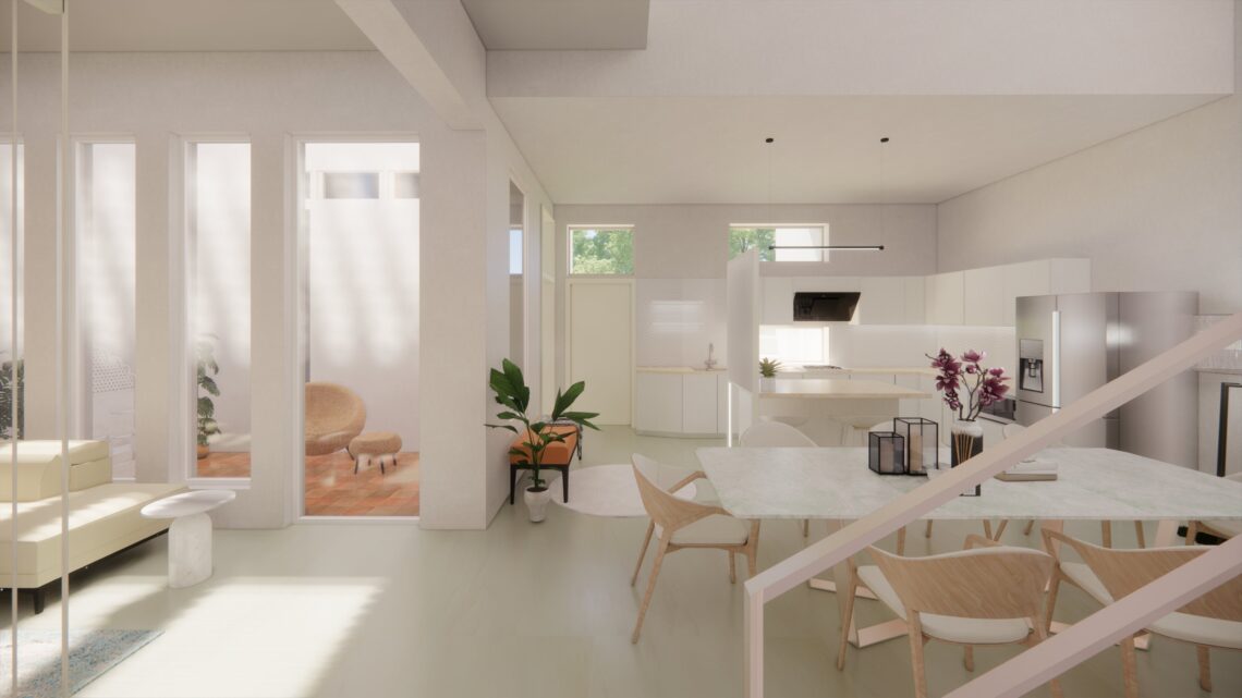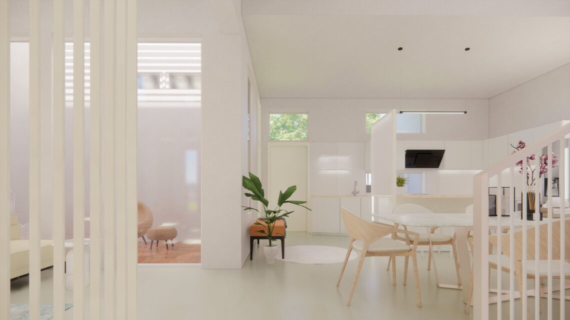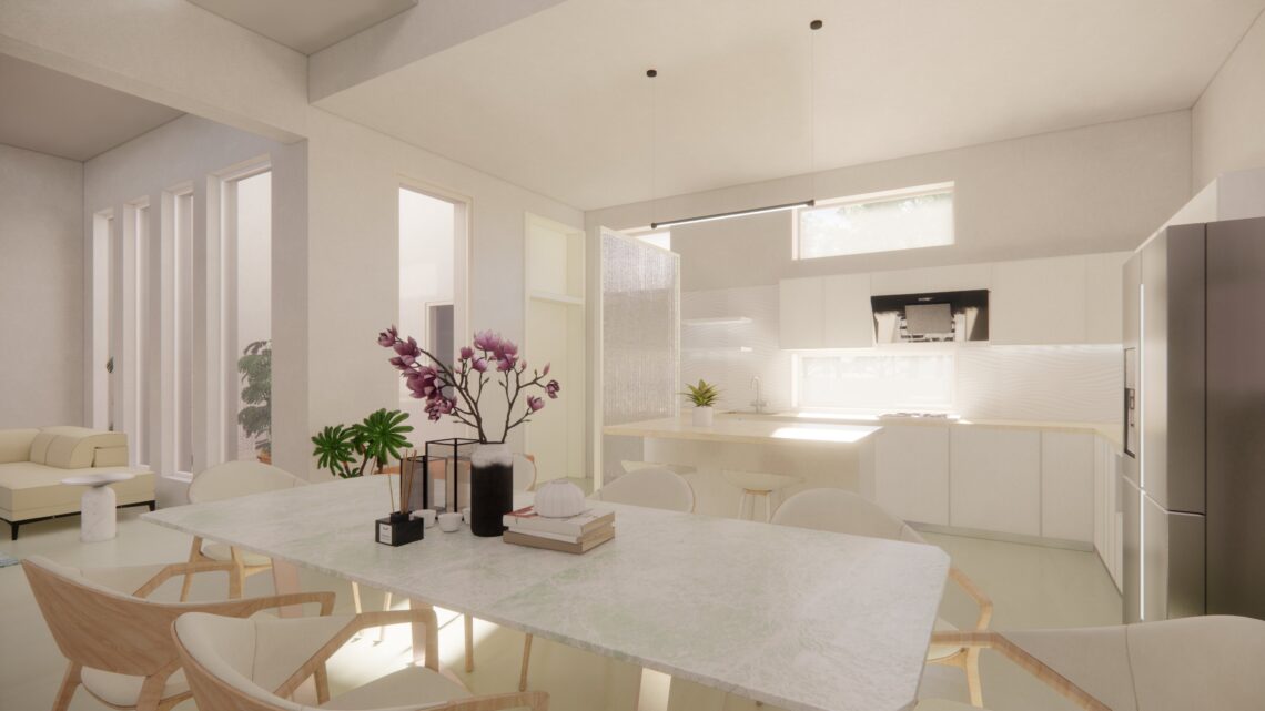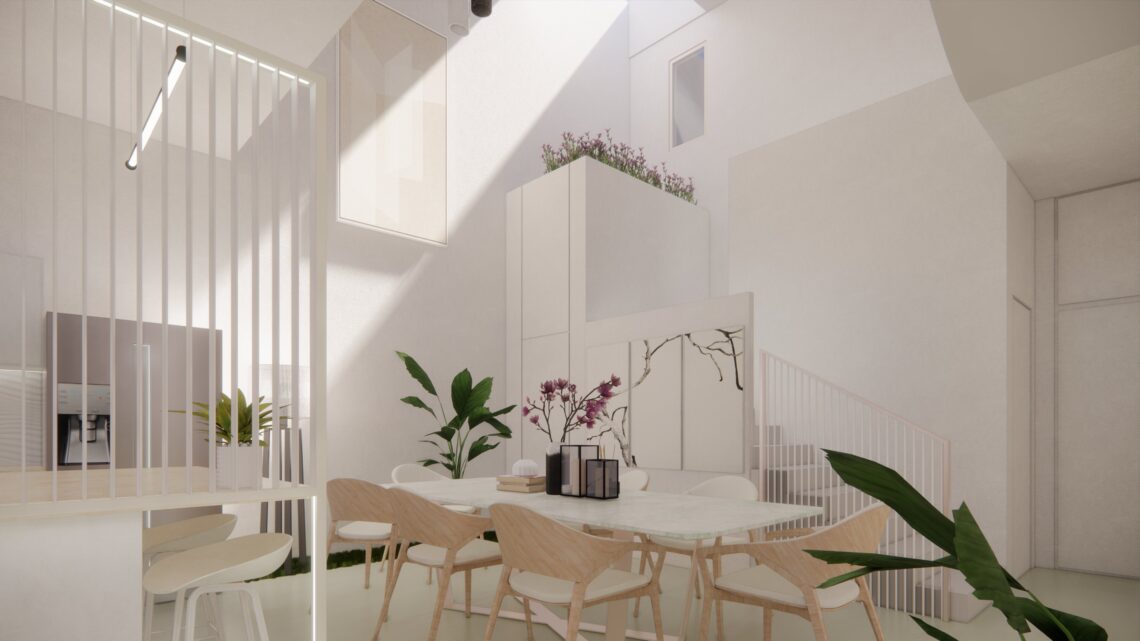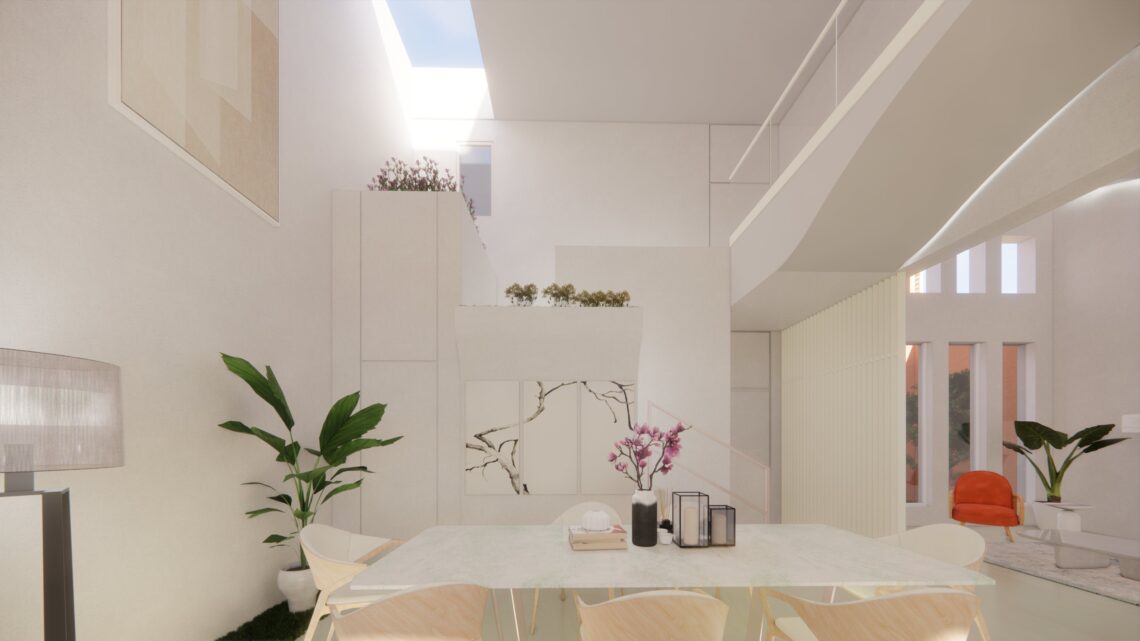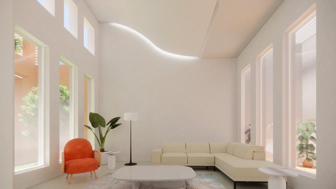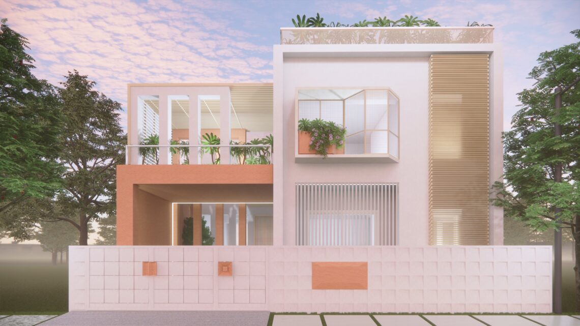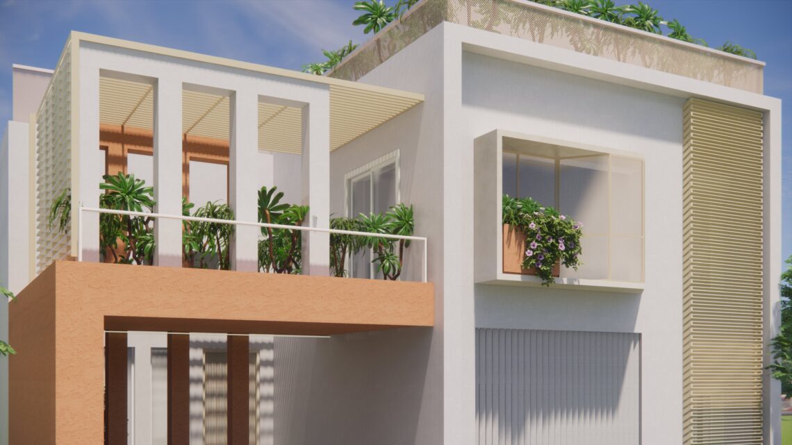 An under-construction residence situated in a gated community with a number of developed gardens and tree lined avenues in the suburbs. The idea was to provide a modern open house with views and lights across all spaces and hours.