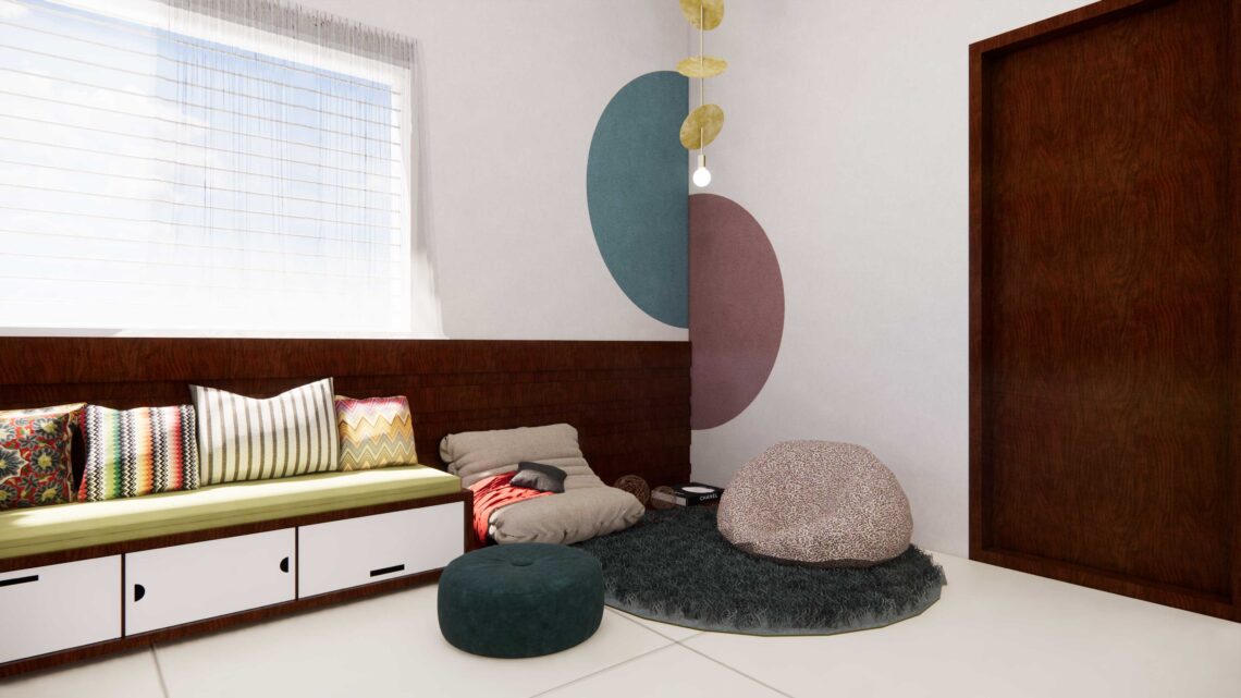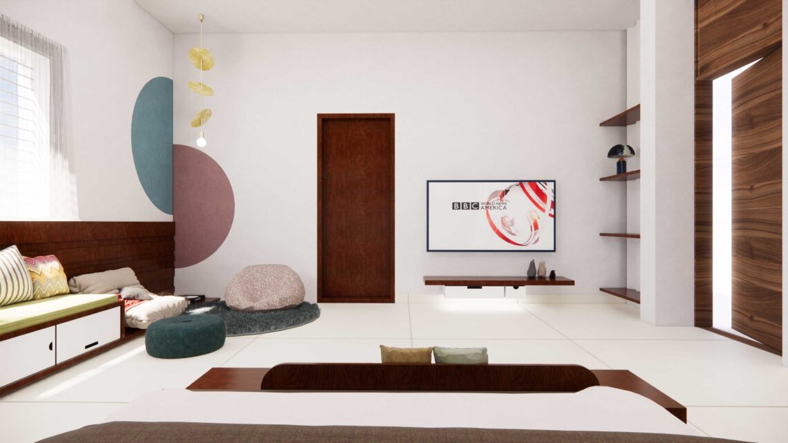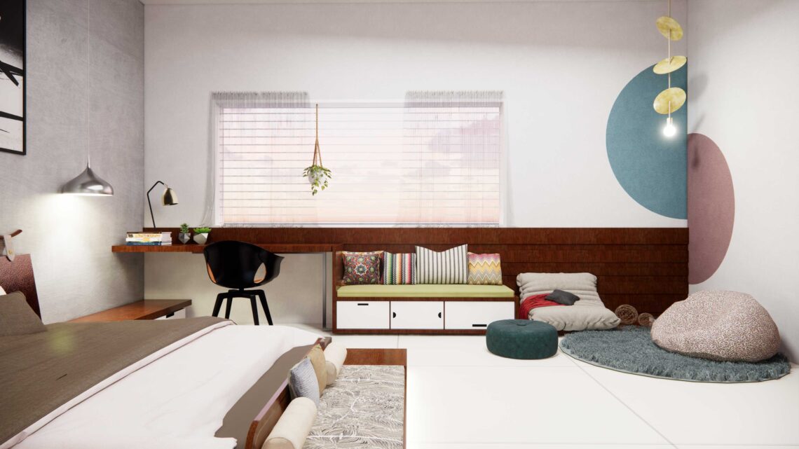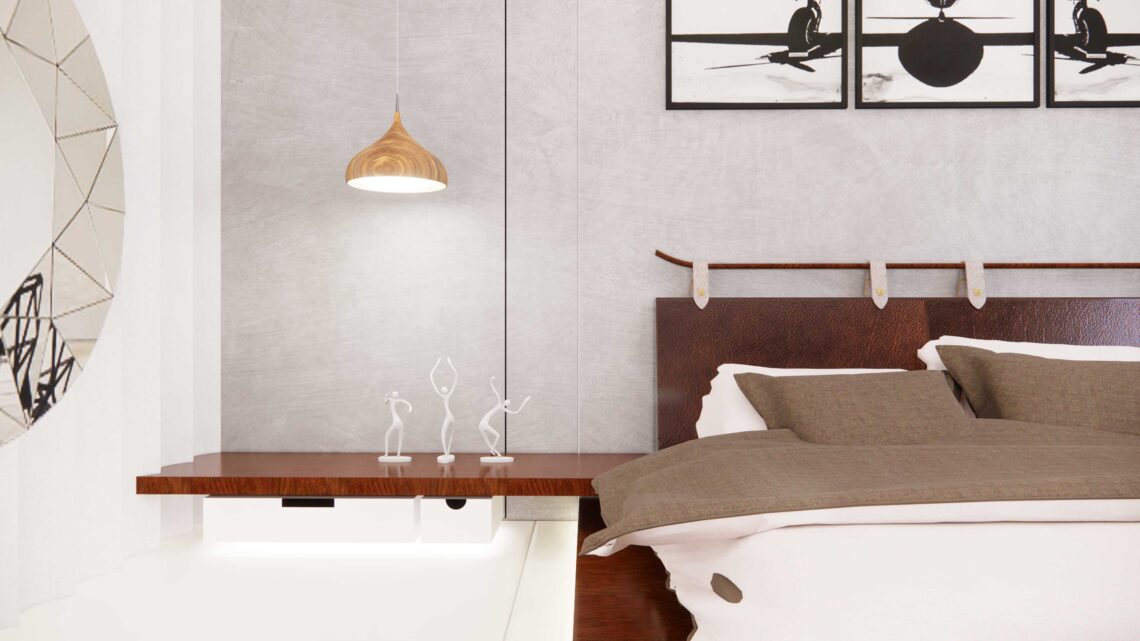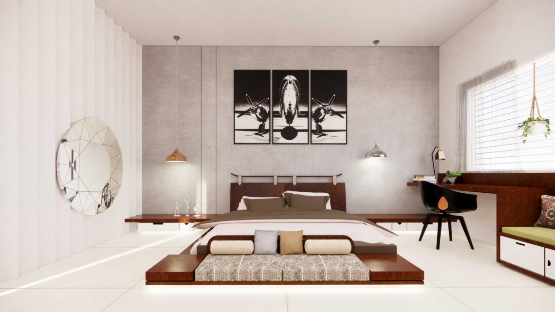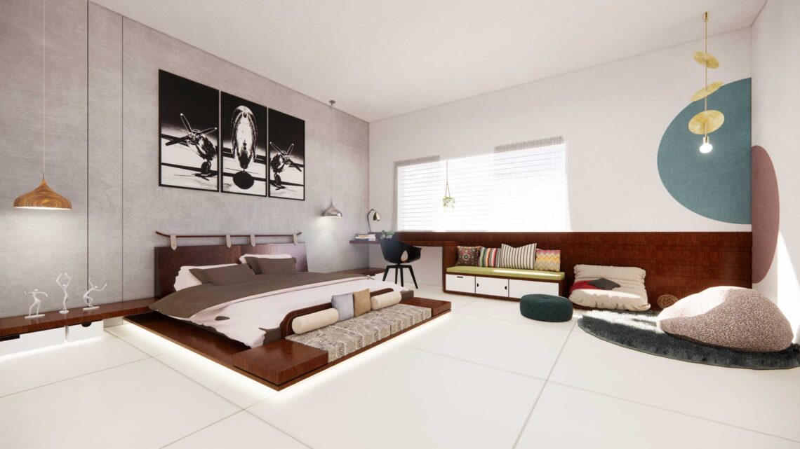 A bedroom interior design with wooden textures and patterns.